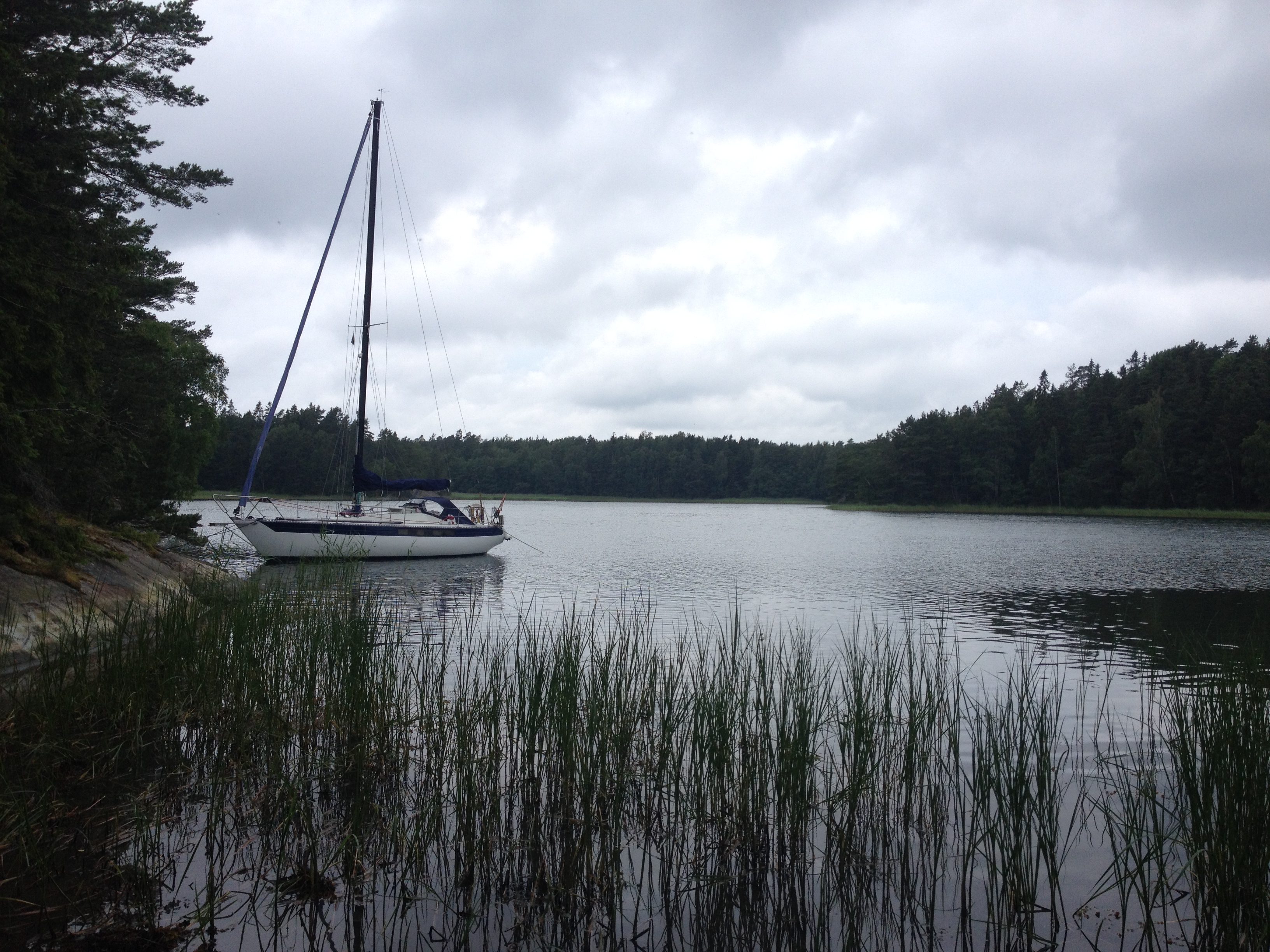 We didn’t get to Björkskär in the end because it clouded over and we decided to head for Gällnö instead, where we did landförtöjning in a bay we’d never been to before, neatly tucked it in behind a protective wall of rock, just as the rain started. But as Wolfgang has already put up the only photo we took today, I shall end here.