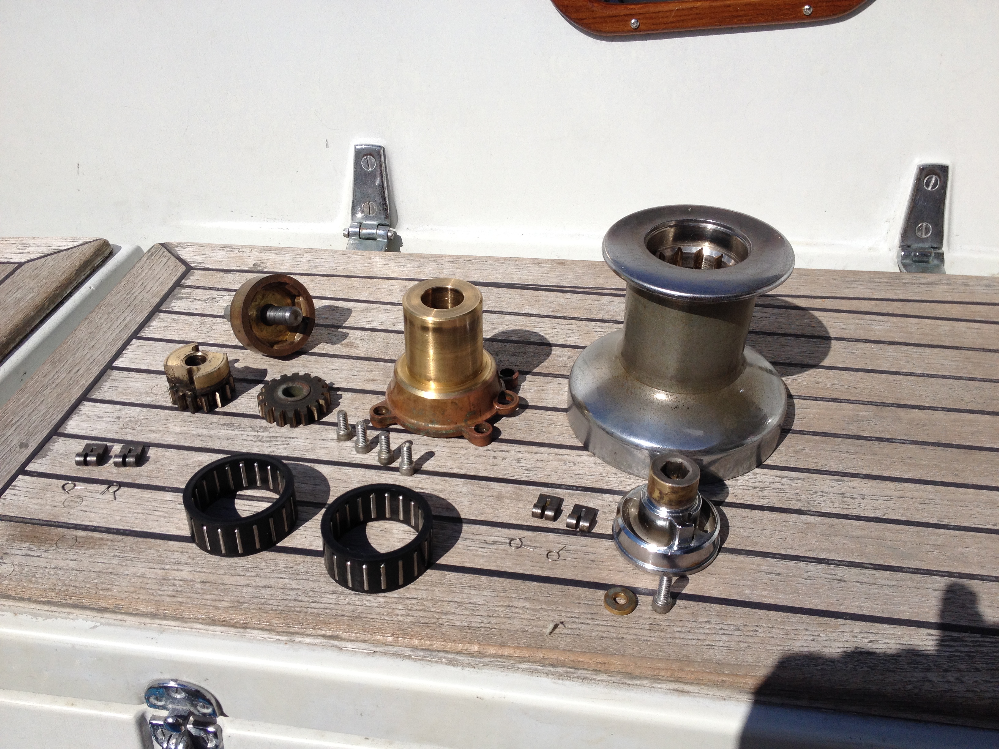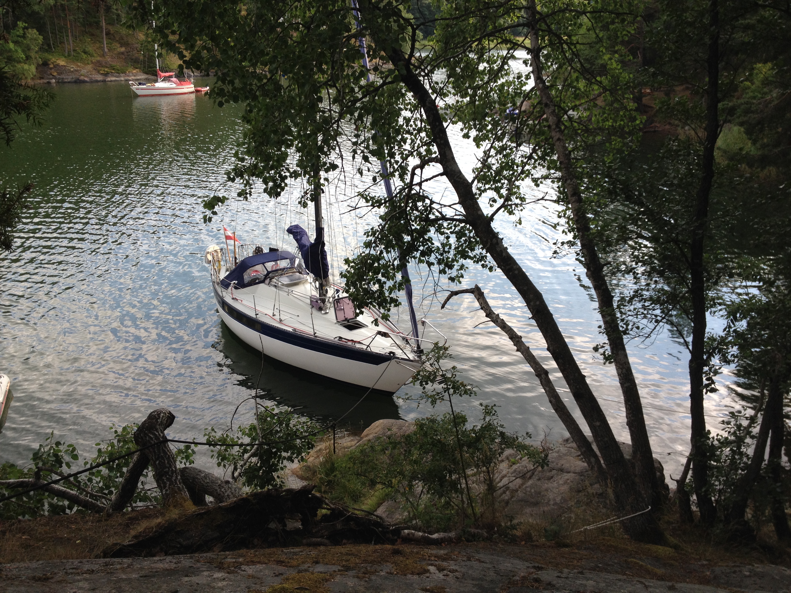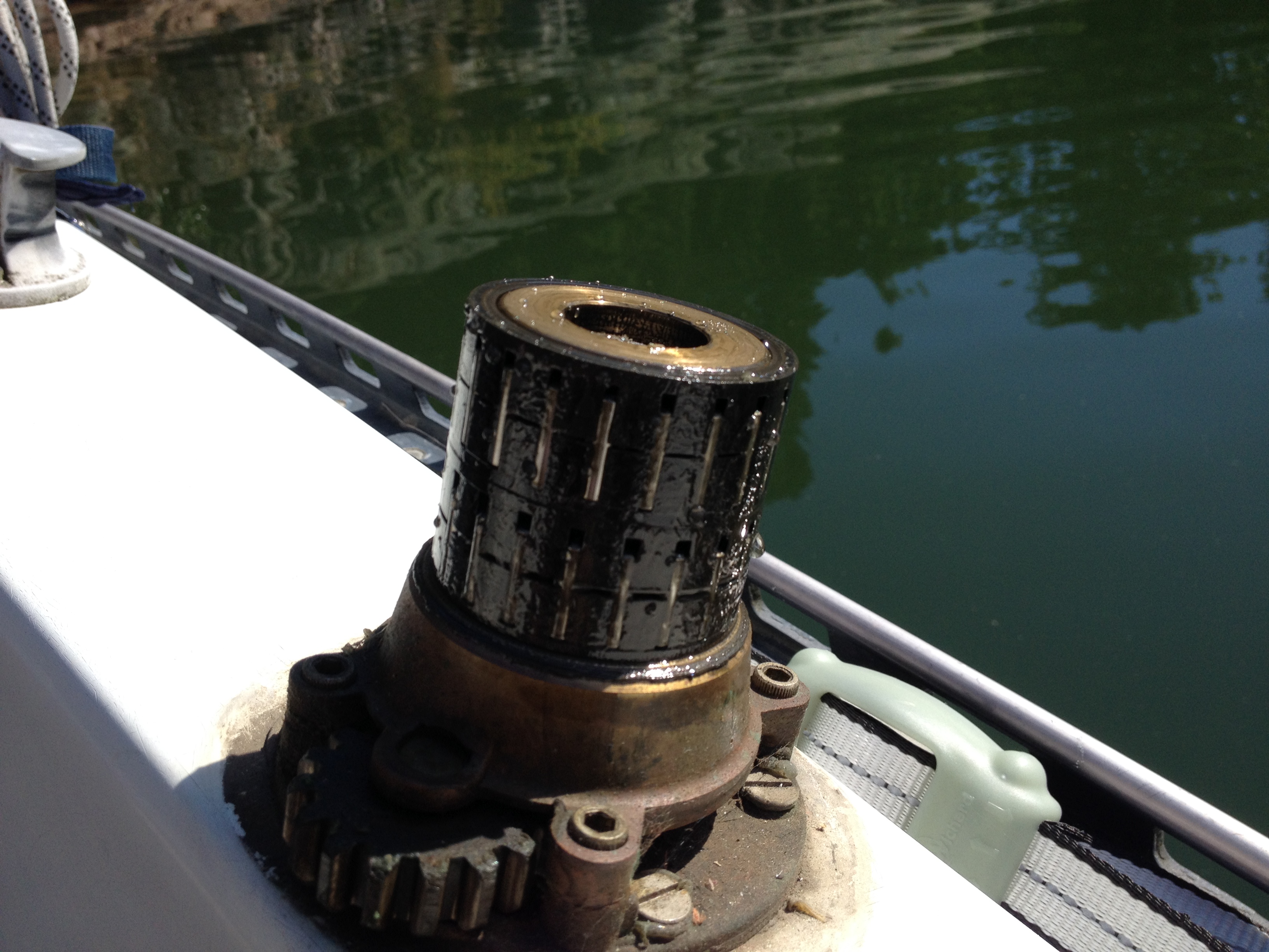 Victoria left on Friday morning and since there was not much wind yesterday and my tendonitis (in German this has the lovely word “Sehnenscheidenentzündung”) has become worse, I decided to stay in the sheltered bay at Kalvholmen. I got up at 6am to make some coffee and to do some “real” work on the notebook. I had finished that at about 9 when I dived into the water to cool down, since by that time it was already 25 degrees. After that I dismantled the 3 starboard winches, cleaned them in diesel , greased them and re-assembled them. This whole process took about 3-4 hours. It is a dirty and fiddly job, but very satisfying once finished. The winches purr with a soft noise and don’t have that harsh metallic sound.