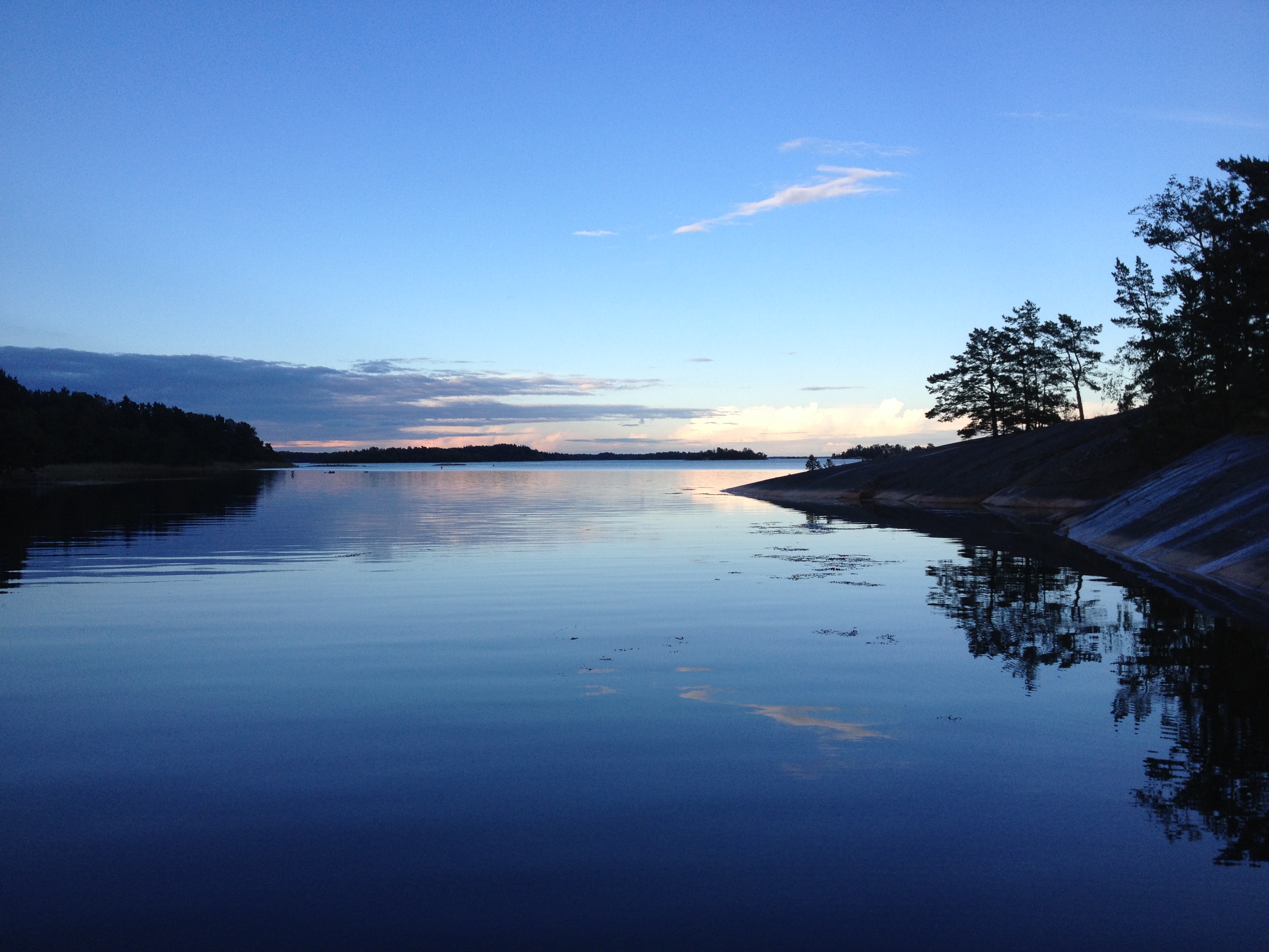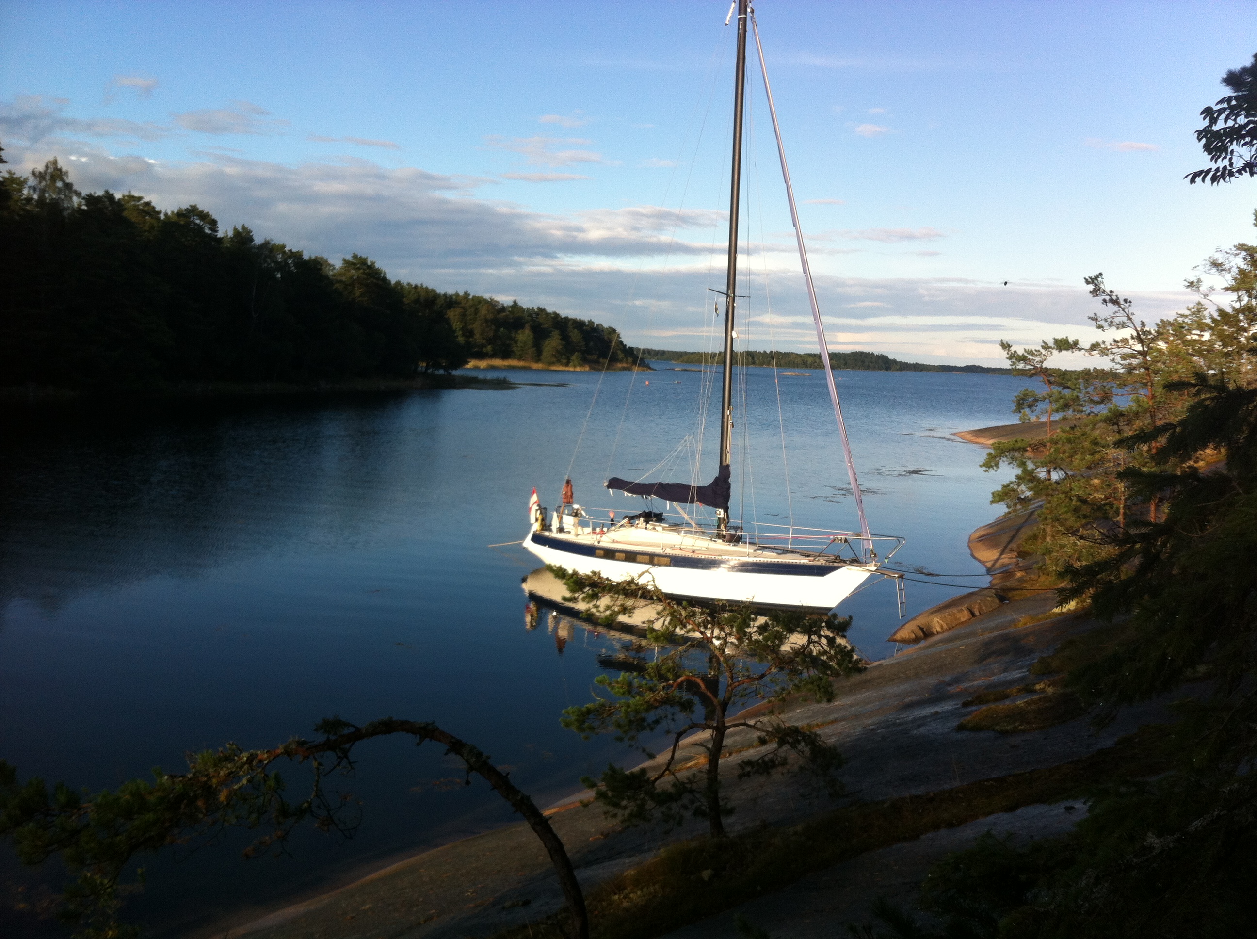 And this was the sunset – the bay was completely sheltered from the wind. Today we sailed in warm sunshine through an area clustered thickly with islands. The wind was coming from the back, so we couldn’t really feel it. It was my favourite kind of archipelago sailing. We moored in a bay that was described as being very sheltered but a bit close to civilisation, and to our amazement we saw a car driving along a road only a hundred metres or so away. A succession of bridges links a chain of islands all the way to Furusund and the road happens to pass Akerholmen.