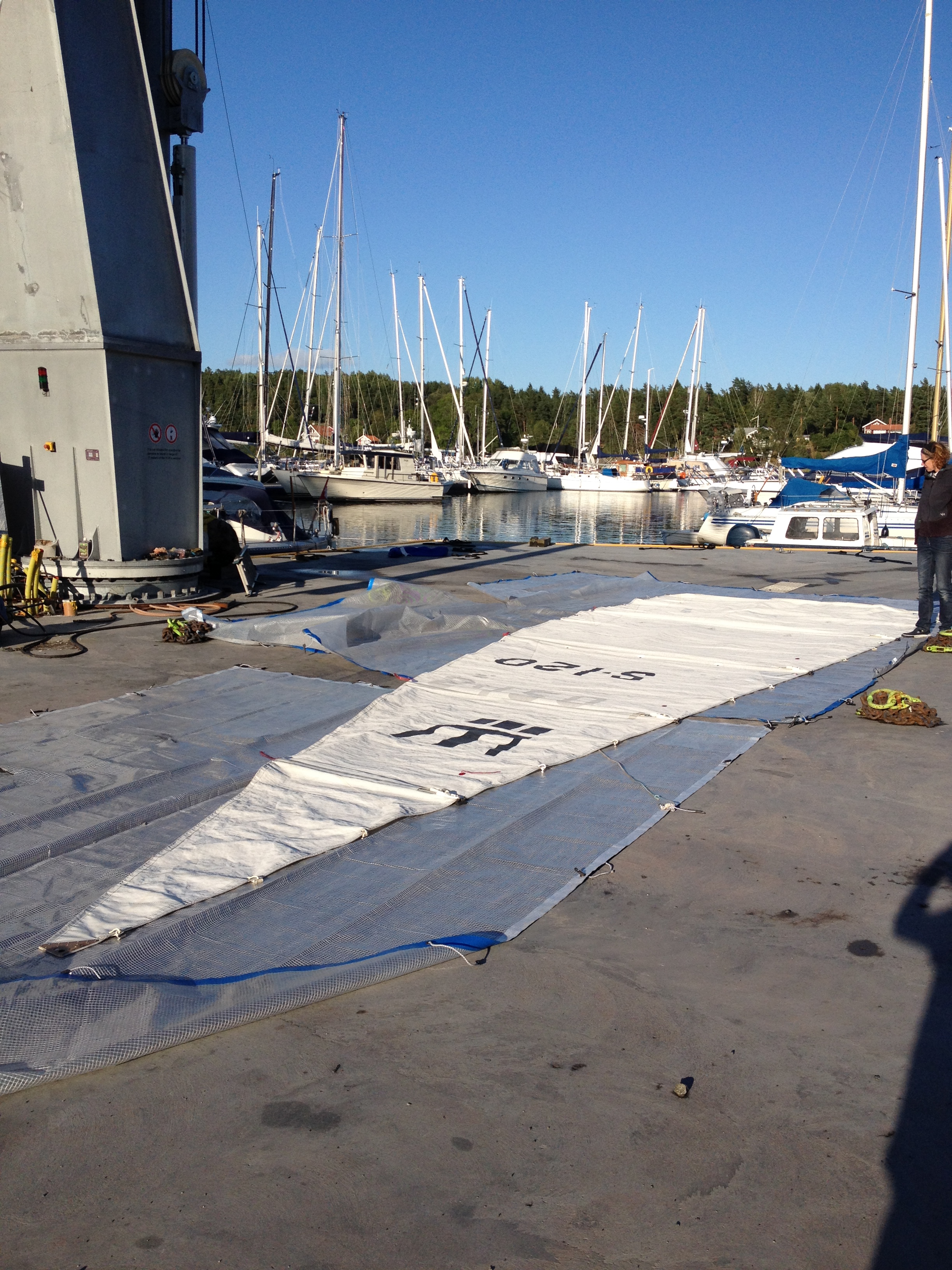 The main sail flat on the ground and ready to be folded and packed for the winter.