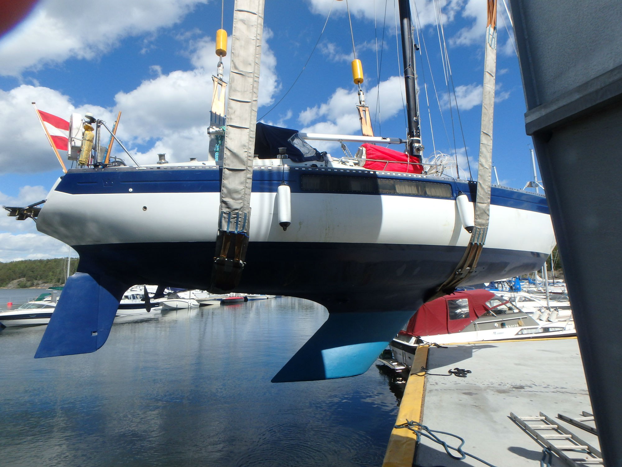 Akka hit the water today! After 9 months on the hard, Akka was lifted into the water this afternoon without much ado. The guys from Ramsmora were really helpful and the whole thing was done in less than 1/2 hour. All went well and no disasters struck. No water was gushing in, the mast did not fall over, the engine started only after 1 little cough.