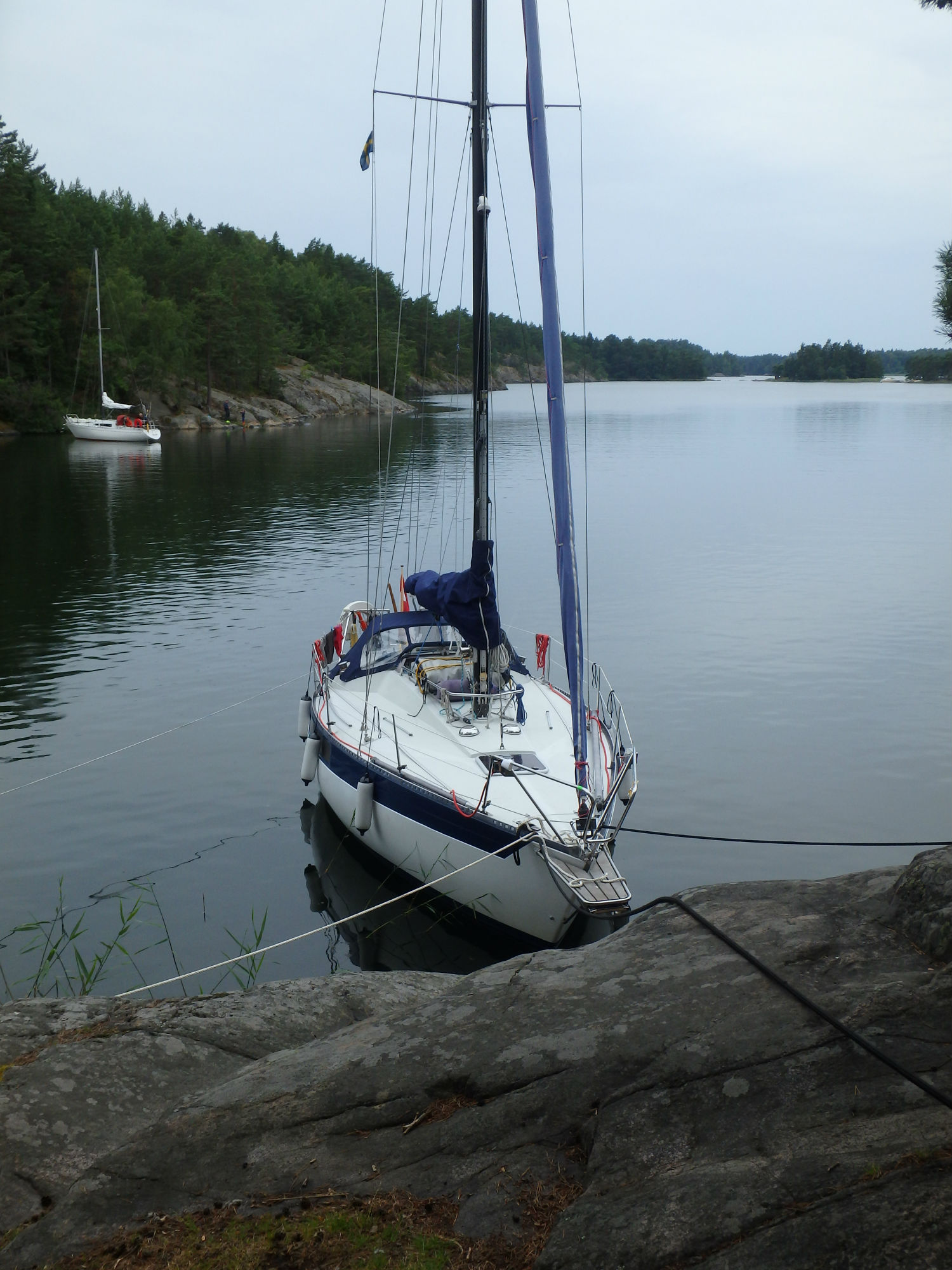 P7251322_aElegance is always on the  mind of the skipper when he ties up his boat. Climbing the aforementioned high rocks is a challenge in this respect but totally impossible when the rocks are wet. So, in preparation of the heavy rain, I brought out 4 lines to tie Akka up and flitted about like a true Austrian mountaineer. Akka was now as safe as possible.