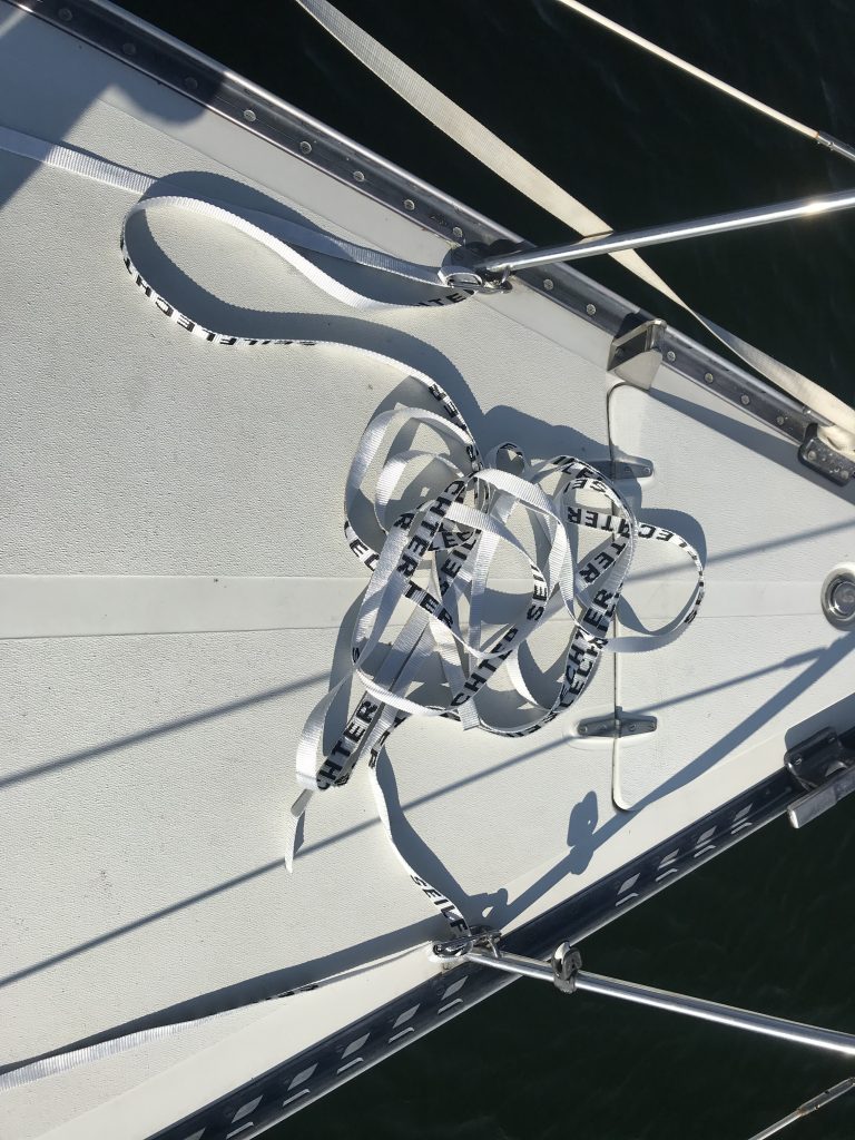 I guess 9 years of no use in anger won’t damage some pretty sturdy safety lines to hook onto when going forward. But then, maybe the sun does weaken the material. Anyway, I did not want to find out the wet way and decided to replace them.