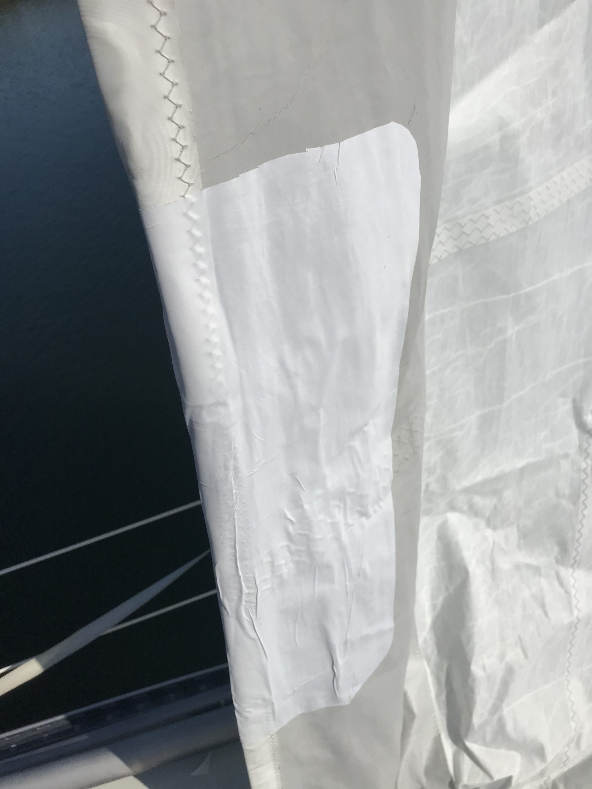 Not a big thing, but the leech cover has come undone on the genoa. I did not want to stitch it back on, so not to damage the cloth, and did a temporary repair with some glue-on repair material. Not a particularly nice job, but it will do the trick for the moment.
