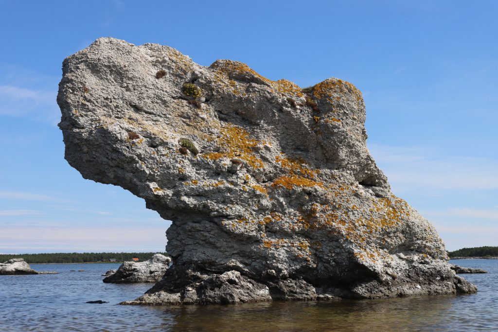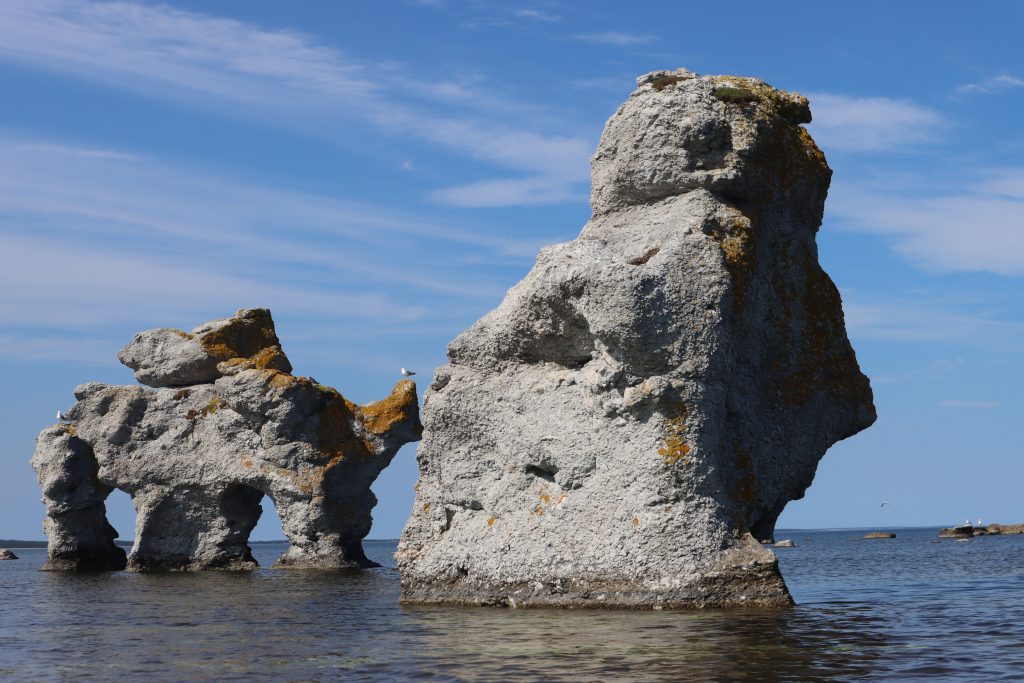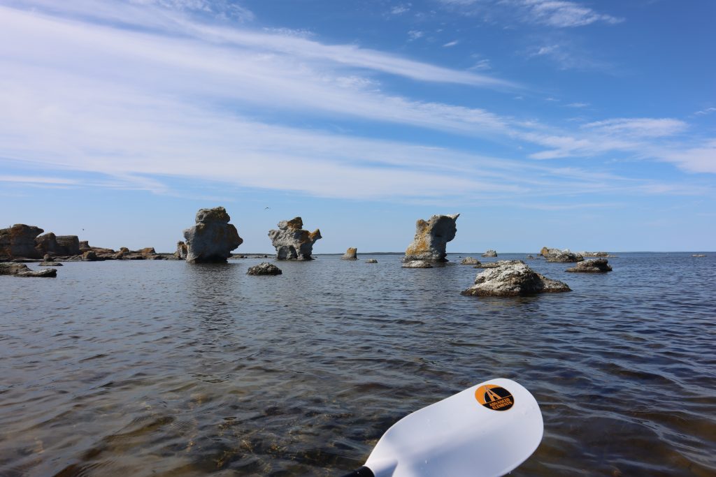 We have been to Fårö before, but the last time we came by car. This time, I not only sailed here, but the bay I have chosen sports some wonderful Raukas (bizarre rock formations sticking out of the ground). They are not as large as the ones at the north side of the island, but I could take the Kayak and have a little morning exercise. On my way back, I passed a little harbour with traditional fishing huts. Very picturesque!