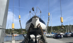 A finally we make a splash. It has taken a long time to get Akka into the water this year. With the train journey, it feels even longer. But yesterday was the day and all went well. Even the new sea cock is OK 🙂 It was a long day…